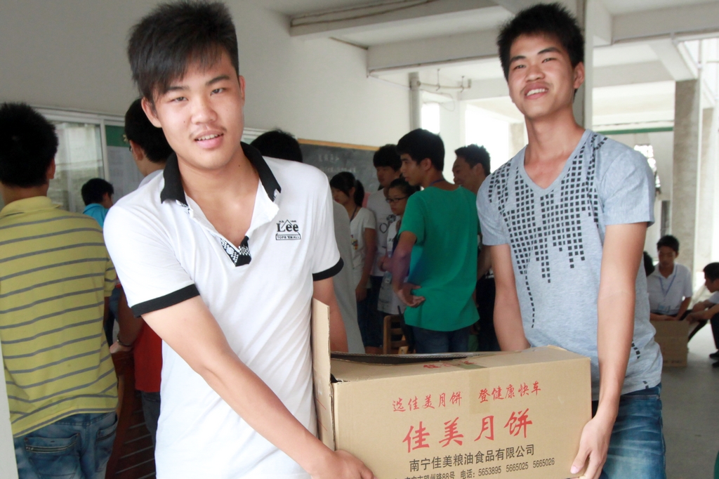 9月27日下午,由学校后勤部门向全体学生发放月饼。班干们把一箱箱月饼抬到班上,同学们领到月饼,喜上眉梢。